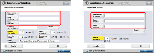 Le impostazioni relative al servizio di stampa possono essere specificate selezionando le opzioni dall'elenco visualizzato quando si preme [Sfoglia] o immettendo la stringa di caratteri per ciascuna voce.