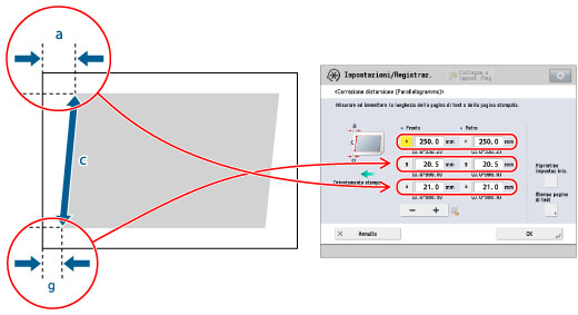 Utilizzando i due valori numerici e "c = 250,0", una periferica regola la lunghezza per correggere la distorsione dell'area di stampa.