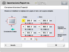 Utilizzando i due valori numerici e "c = 250,0", una periferica regola la lunghezza per correggere la distorsione dell'area di stampa.