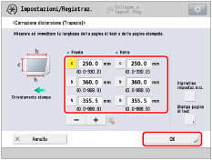[c]: | Immettere la lunghezza misurata dal bordo di testa sinistro dell'area di stampa al bordo di testa destro dell'area di stampa. |