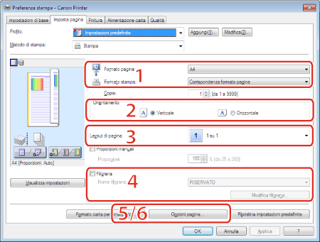 3. Layout di pagina | Stampa più pagine organizzate su un solo foglio (vedere "Stampa di più pagine su un unico foglio"). | 4. Filigrana | Stampa le pagine con una filigrana (ad esempio "COPIA") sovrapposta sul documento (vedere "Stampa filigrana"). |