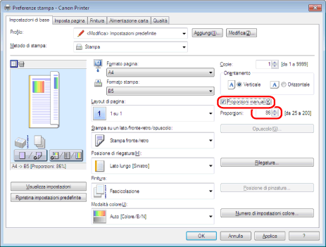 È possibile configurare questa funzione anche nella scheda [Imposta pagina]. A seconda del formato carta selezionato al momento dell'ingrandimento/riduzione, si potrebbero avere margini più ampi del necessario o potrebbero mancare parti del documento. A seconda dell'applicazione utilizzata, potrebbe essere data la priorità all'impostazione di ingrandimento/riduzione nell'applicazione. La visualizzazione, il tipo e la versione del driver della stampante potrebbero variare a seconda del sistema operativo. |