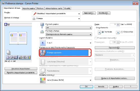 Selezionare [Stampa opuscolo] da [Stampa su un lato/fronte-retro/opuscolo].