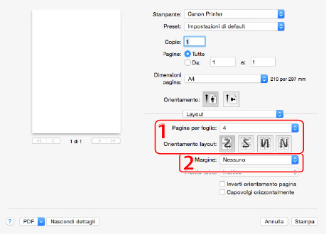 1. Layout di pagina | Stampa più pagine su un foglio (vedere "Stampa di più pagine su un foglio"). | 2. Margine pagina | Stampa ogni pagina con un margine. |