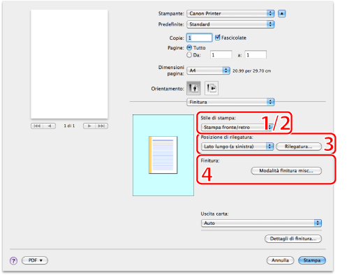 3. Posizione di rilegatura/rilegatura | Imposta l'orientamento e l'ampiezza della rilegatura. | 4. Finitura | Specifica il metodo di consegna nel vassoio di consegna. |