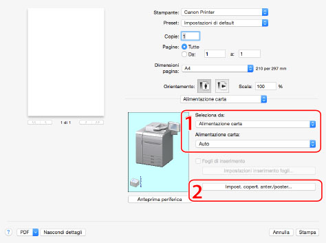 1. Alimentazione carta | Quando si desidera stampare su un specifico tipo di carta, specificare la fonte di alimentazione o il tipo di carta desiderata. | 2. Copertina anteriore/posteriore | Utilizza per la copertina anteriore e posteriore una tipologia di carta differente da quella utilizzata per il corpo del documento. |