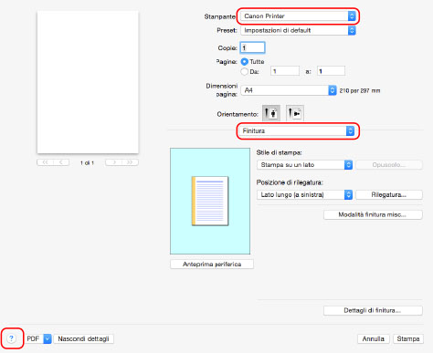 Selezionare la stampante da [Stampante] → selezionare un riquadro di preferenze → fare clic su [