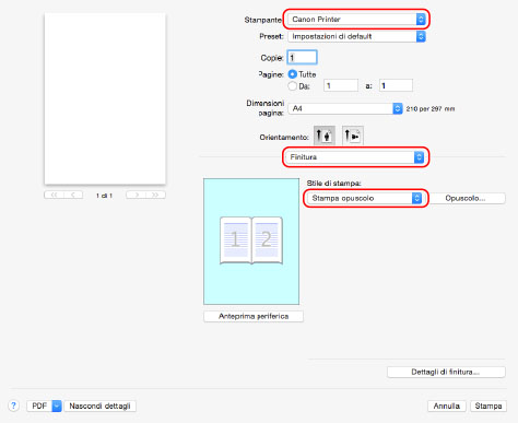 Selezionare la stampante → [Finitura] → [Stampa opuscolo] da [Stile di stampa].