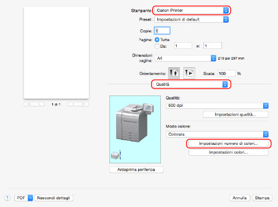 Selezionare la stampante → [Qualità] → fare clic su [Impostazioni numero di colori].