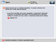 Se si imposta 'On' per il Modo Funzioni limitate dalla schermata Messaggio di richiesta di un intervento di assistenza, anche [Modo funzioni limitate] in [Impostazioni gestione] (Impostazioni/Registrazione) viene impostato su 'On'. (Vedere "Esclusione dell'uso delle funzioni".) |