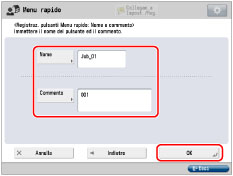 Il numero di pulsanti personalizzati che è possibile registrare potrebbe essere inferiore al massimo, a seconda dell'utilizzo della memoria della funzione Menu rapido. Per le istruzioni relative all'utilizzo di un pulsante personalizzato/pulsante condiviso, vedere "Richiamo di un pulsante personalizzato/pulsante condiviso". Se non è stata impostata la funzione di autenticazione, i pulsanti personalizzati non verranno visualizzati. |