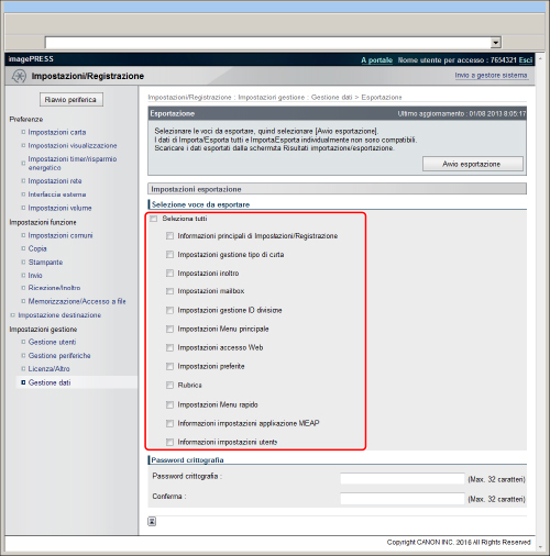 Se si importano le Impostazioni gestione ID divisione quando si utilizza la funzione Importa tutti, le impostazioni delle informazioni del gestore di sistema, come l'ID e la password, sono sovrascritte. Controllare le informazioni del gestore di sistema sulla macchina di esportazione prima di utilizzare la funzione Esporta tutti, poiché sono richieste quando si accede alla macchina di destinazione per l'importazione. La funzione Esporta tutti non è disponibile nelle seguenti situazioni: Esecuzione/attesa di qualsiasi lavoro (invio, inoltro, ricezione di i-fax, stampa di rapporti, funzioni specificate dal modo Invio differito) Durante un'operazione di Importa/Esporta individualmente Visualizzazione della rubrica mediante la IU remota da un'altra serie imagePRESS Distribuzione delle informazioni sulla periferica Mentre si verifica un errore Backup dei dati delle mailbox |