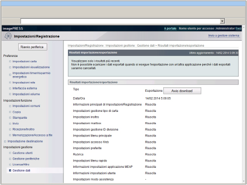 La schermata dei Risultati importazione/esportazione non può essere visualizzata fino al termine dell'esportazione. Facendo clic su [Avvio download], è possibile scaricare i file di esportazione. È inoltre possibile controllare gli ultimi risultati di importazione/esportazione premendo [Gestione dati] per <Impostazioni gestione> → [Risultati importazione/esportazione]. |