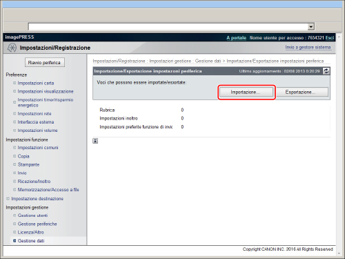 Se si importano le impostazioni di un elenco indirizzi (Elimina e sovrascrivi) o le Impostazioni inoltro, le informazioni memorizzate in [Impostazioni preferite] nel pannello comandi della macchina e nella memoria di richiamo vengono cancellate. |
