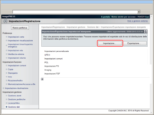 Se si importano le impostazioni periferica, viene importato anche l'elenco indirizzi. In questo modo le destinazioni registrate vengono eliminate e sovrascritte con le destinazioni nel file importato. Per applicare le impostazioni della periferica importate, occorre riavviare la macchina. Al termine dell'importazione, spegnere e riaccendere la macchina con l'interruttore principale. Dopo avere importato le impostazioni della periferica, l'IU remota non può essere utilizzata per eseguire altre operazioni finché la macchina non viene riavviata. Spegnere e riaccendere la macchina con l'interruttore principale. Se i dati esportati da questa macchina vengono importati in una macchina di modello differente, [Impostazioni preferite] nel pannello comandi non viene aggiornato. Se nella rubrica remota viene specificato l'indirizzo come destinazione inoltro, le impostazioni inoltro non verranno importate. Tuttavia se la macchina che esporta le informazioni di impostazione e la macchina target che importa usano la stessa rubrica remota, si potranno usare le impostazioni inoltro nella macchina target per l'importazione. Per ulteriori informazioni sulla rubrica remota, vedere "Specifica delle destinazioni utilizzando la Rubrica (remota)". |