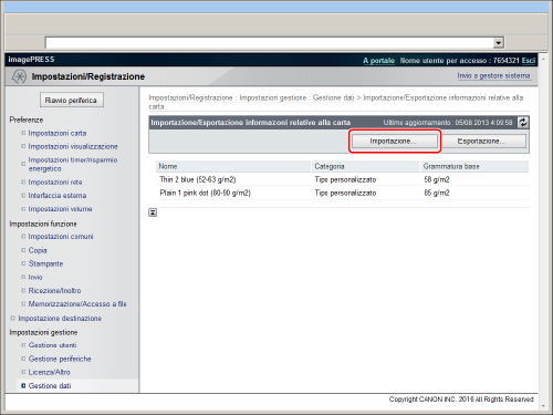 Se la macchina sta eseguendo altri processi, non avviare l'importazione. Per le istruzioni relative all'accensione o allo spegnimento della macchina, vedere "Alimentazione principale e tasto risparmio energetico". |