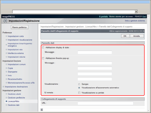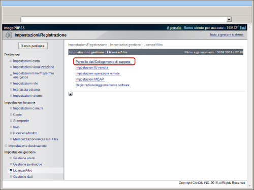 Fare clic su [Impostazioni/Registrazione] → selezionare [Licenza/Altro] dal menu visualizzato in Impostazioni gestione → fare clic su [Pannello dati/Collegamento di supporto].