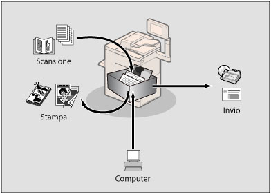 Consente agli utenti di registrare i file acquisiti con la macchina oppure i dati inviati da un PC tramite driver di stampa. È possibile stampare all'occorrenza il documento registrato utilizzando le impostazioni desiderate. Inoltre, è possibile convertire il formato di documenti con un formato diverso, come PDF, da inviare tramite e-mail o fax con la funzione Invio.