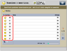 È possibile acquisire e memorizzare fino a 999 pagine contemporaneamente. Se gli originali fronte-retro vengono acquisiti con l'alimentatore, è possibile memorizzare fino a 1.000 pagine. Quando viene raggiunto il numero massimo di originali acquisibili, viene visualizzato un messaggio che chiede se memorizzarli. Per verificare che il file sia stato memorizzato correttamente, premere → [Lavoro] → [Registro lavori] → selezionare [Memorizza] dall'elenco a comparsa. Se il risultato viene visualizzato come "NG", premere [Dettagli] per controllare il codice di errore. Per ulteriori informazioni sulle cause e i rimedi per ciascun codice di errore, vedere "Elenco dei codici di errore senza messaggio".. |