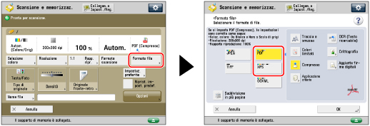 Se il formato di file è PDF, è possibile ridurne le dimensioni utilizzando la funzione [Colori limitati]. Per ulteriori informazioni, vedere "PDF Colori limitati". |
