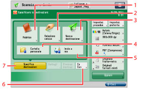 5 | [Invio a me] Premere per specificare come destinazione il proprio indirizzo e-mail. L'amministratore può limitare l'invio di e-mail da parte degli utenti generici solo ai loro indirizzi. (Vedere "Impostazione di una destinazione limitata per l'invio di e-mail".) |