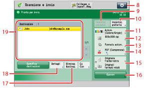 10 | [Impostaz. preferite] Premere questo tasto per registrare le impostazioni di invio utilizzate frequentemente. Le impostazioni registrate possono essere richiamate in un secondo momento. |
