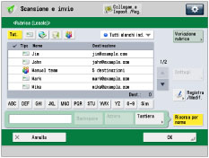 1 | Pulsante di selezione del tipo di destinazione Premere [Tut.], (E-Mail), (Fax), (I-Fax), (File), (Gruppo) per visualizzare le destinazioni registrate per ciascun tipo. |