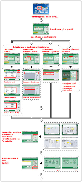 Per poter inviare i documenti acquisiti ad un indirizzo e-mail, ad un indirizzo I-fax oppure ad un file server, si devono configurare le impostazioni della rete. (Vedere "Impostazioni di comunicazione comuni per e-mail/I-Fax".) |