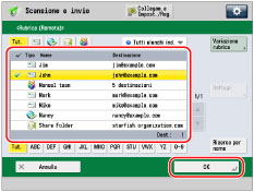 Per annullare la destinazione selezionata, selezionarla di nuovo. Se si seleziona una sola destinazione, premere per effettuare l'invio dalla schermata della Rubrica. |