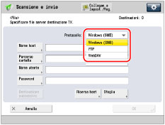 [Nome host]: | Premere [Nome host] → immettere l'indirizzo IP, FQDN o il nome NetBIOS → premere [OK]. |