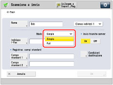 Se non si devono inviare documenti tramite server e l'indirizzo IP del destinatario non è registrato con un server DNS, immettere il nome di dominio nel seguente formato: (utente)@(indirizzo IP del destinatario). |