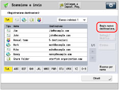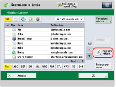 Il primo carattere immesso per il nome viene utilizzato per ordinare l'elenco delle destinazioni quando si premono i tasti [ABC], [DEF] e [GHI] nella schermata Rubrica. Selezionando [Ricerca per nome] nella schermata della Rubrica, viene visualizzata una schermata per restringere la ricerca nella Rubrica. |