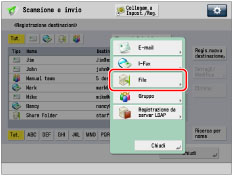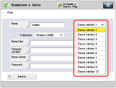 Se l'opzione [Attivaz./disattivaz.variazione lingua/tastiera] è impostata su 'On', il nome host e il percorso della cartella sul file server di destinazione potrebbero non essere visualizzati correttamente e potrebbe essere impossibile esplorarli. (Vedere "Attivazione di Variazione lingua/tastiera".) |