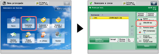 → [Scansione e invio] → specificare la destinazione → premere il pulsante della risoluzione.