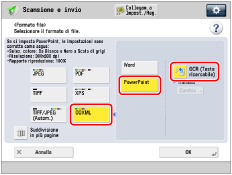 → [Scansione e invio] → specificare la destinazione → premere il pulsante del formato del file.