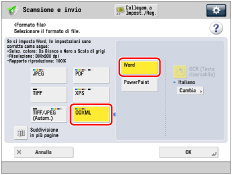Se si seleziona il formato file PDF (OCR), XPS (OCR) o OOXML (OCR) e <Riconoscimento automatico> è impostato su 'On' in [Impostazioni OCR (Testo ricercabile)] (Impostazioni/Registrazione), l'orientamento dell'originale viene riconosciuto e, se necessario, il documento viene ruotato automaticamente prima di essere inviato. (Vedere "Impostazioni per la creazione di PDF/XPS/OOXML ricercabili".) Se si seleziona [OCR (Testo ricercabile)], è possibile inviare solo con un rapporto di zoom di [1:1 (100%)] o [Autom.]. Se si seleziona il formato file PDF o XPS, è possibile impostare [Compresso] e [OCR (Testo ricercabile)] contemporaneamente. In questo caso, nella schermata Funzioni di base Scansione e invio come formato del file viene visualizzato [PDF (Compresso)] o [XPS(Compresso)]. Se si seleziona [Word] per [OOXML], è possibile impostare di eliminare le immagini di sfondo acquisite. È possibile generare file Word facili da modificare senza immagini indesiderate. (Vedere "Eliminazione delle immagini di sfondo durante la generazione di file Word".) |