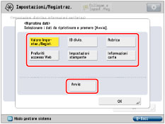 Se non si ripristinano i dati per [Valore Impostaz./Regist.] e [Rubrica] contemporaneamente, le impostazioni in [Impostaz. invio URL] per [Impostazione mailbox fax/I-Fax] e [Impostazioni mailbox] potrebbero essere cancellate. |