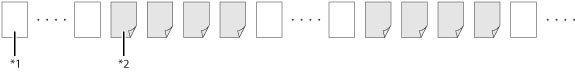Questa impostazione è efficace se l'originale è costituito, ad esempio, ma più pagine su un solo lato, otto o meno pagine fronte-retro, più pagine su un solo lato e otto o meno pagine fronte-retro, come illustrato sotto. In tutti gli altri casi, selezionare [Off], altrimenti la stampa dell'originale potrebbe richiedere del tempo. *1 pagina su un lato *2 pagina fronte-retro |