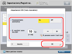 Selezionare [On] per <Riconoscimento automatico> → selezionare [-] o [+] per <N. caratteri nome file OCR> per impostare il numero di caratteri per il nome file → selezionare [OK].