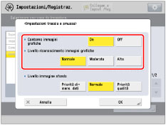 Se si aumenta <Livello riconoscimento immagini grafiche>, aumenta anche la dimensione dei dati. È consigliabile selezionare dapprima il livello [Normale] e, se il risultato ottenuto non è soddisfacente, provare ad aumentare il livello impostando [Moderato] o [Alto]. |