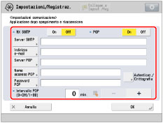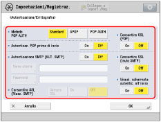 Premere [On] per <Autenticaz. POP prima di invio> → [Off] per <Autenticazione SMTP (AUT. SMTP)>.
