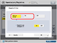 Per maggiori informazioni sul Rapporto TX fax, vedere "RAPPORTO TX FAX/RAPPORTO TX FAX CON ERRORE". Se [Rapporto TX] in [Impostazioni funzione] (Impostazioni/Registrazione) è impostato su 'Solo se errore' oppure su 'On', con il Rapporto TX fax viene stampato un Rapporto delle trasmissioni. Se viene eseguita una trasmissione in sequenza quando Rapporto TX fax è impostato su 'On', viene stampato un Rapporto Multi TX fax. (Vedere "RAPPORTO TX FAX MULTIPLE".) |