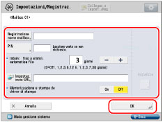Se si imposta la macchina in modo da inviare tramite e-mail un link alla mailbox nella quale è registrato il file, è possibile controllare o eseguire le operazioni sul file nella mail box, utilizzando la IU (Interfaccia utente) remota. Per inviare un link alla mailbox tramite e-mail, selezionare [Impostaz. invio URL] → specificare la destinazione → premere [OK].