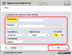 Se si inserisce una pausa alla fine del numero, la pausa dura sempre 10 secondi. Premere [Impostazione dettagli] per impostare il sottoindirizzo, la password, TX in ECM, Velocità invio e Internazionali. Se sono state impostate più linee telefoniche sulla macchina, è possibile selezionare anche la linea da utilizzare per la trasmissione. |