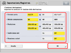 Impostare le condizioni per la destinazione in base alle specifiche della macchina di destinazione. Se si impostano condizioni non supportate dalla macchina di destinazione, si può verificare un errore di trasmissione. |