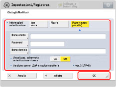 Se la versione del server LDAP è la 3, non è necessario specificare [Posizione inizio ricerca]. (Se la versione del server LDAP è la 3, la macchina preleva automaticamente le impostazioni dal server e imposta la posizione di inizio ricerca). Se la versione del server LDAP è la 2, è invece necessario specificare [Posizione inizio ricerca].