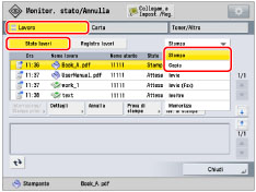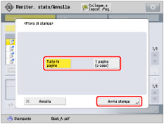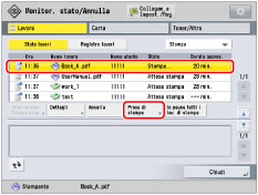 Quando l'esempio viene consegnato, la macchina elabora automaticamente il lavoro di stampa. Se è necessario regolare le impostazioni, premere [Annulla] o [In pausa tutti i lav. di stampa] ed effettuare la regolazione necessaria. |