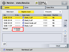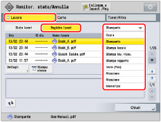 È possibile stampare elenchi degli stati dei lavori per i lavori di Invio/Invio (Fax) oltre agli elenchi dei registri dei lavori. Per stampare gli elenchi degli stati dei lavori, selezionare [Invio] o [Invio (Fax)] dall'elenco a discesa → premere [Stampa elenco]. |