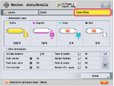 È possibile controllare lo stato dei consumabili, ad esempio la quantità residua di toner e di punti. Inoltre è possibile controllare lo stato di backup dei dati memorizzati.