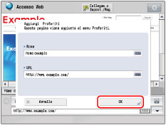 <Nome> e <URL> vengono visualizzati automaticamente. La pagina web registrata viene aggiunta all'elenco che compare quando si preme [Preferiti]. In Preferiti è possibile registrare fino a 20 segnalibri. Per ciascun nome e URL presente in Preferiti, è possibile immettere fino a 255 caratteri. |